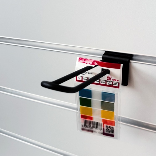 One of the most common Slatwall panel attachments is the double prong Slatwall hook. Its simplicity allows it to be used in most retail settings and is sometimes referred to as looped hooks or Slatwall euro hooks. The diameter of the wire used to form the prongs is 4.8mm. This is soldered to a metal back plate and fits straight into practically all Slat panels.