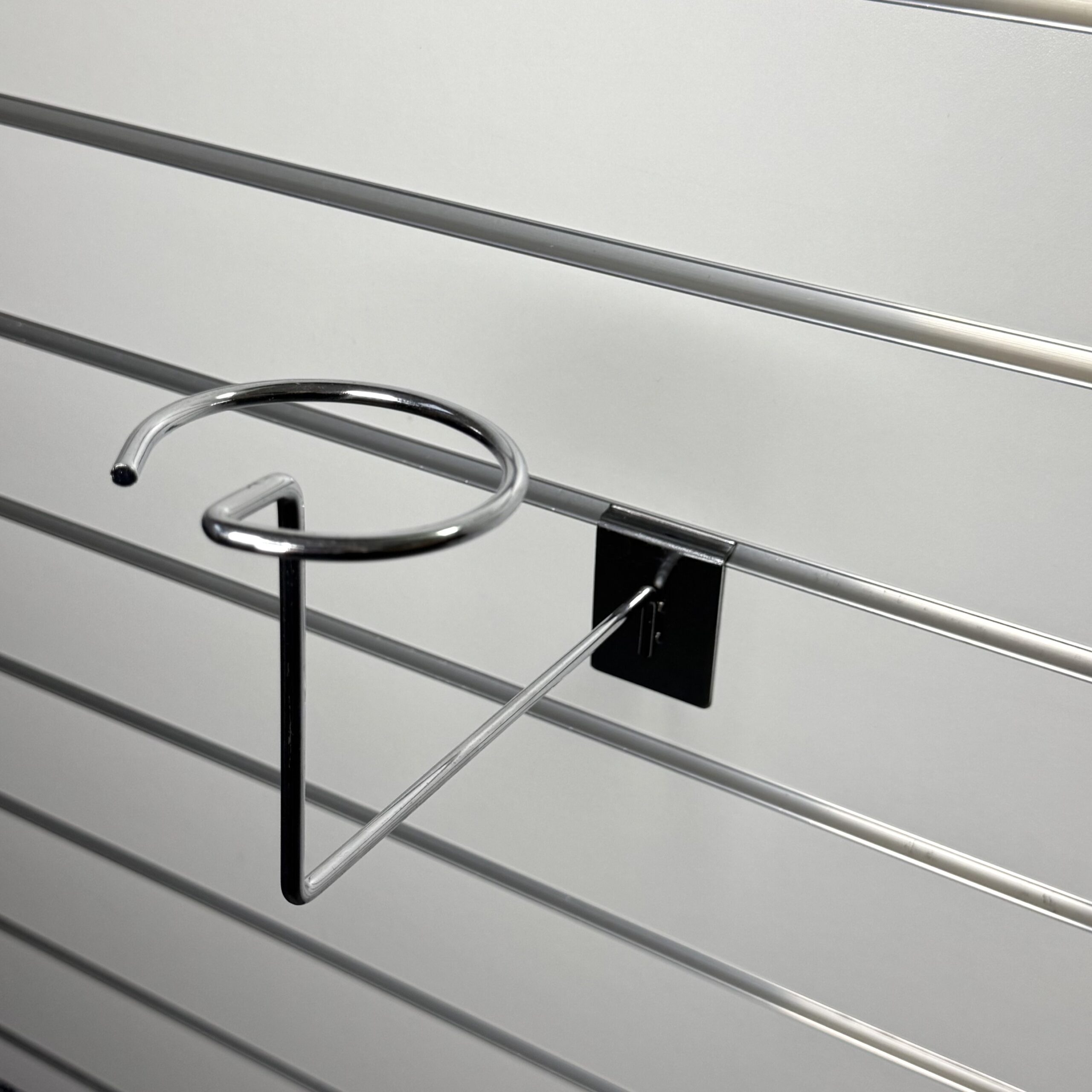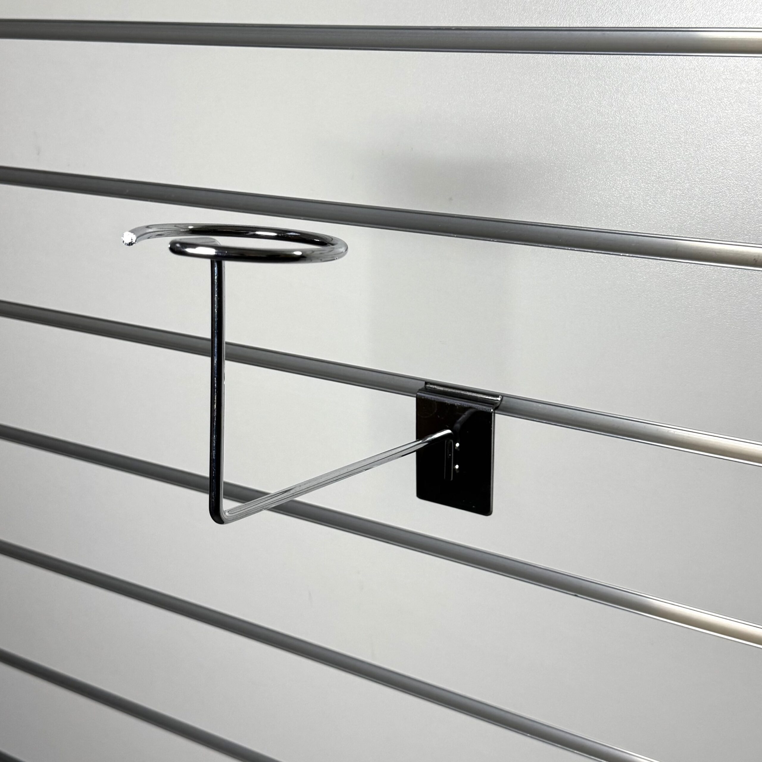 The Slatwall hat arm display is one of the most popular accessories used with a Slatwall panel for displaying hats. Its simplicity allows it to be used for a large number of headware. The arm has a 255mm projection. The loop at the top has a diameter of 80mm. This has been welded onto a metal back plate, allowing it to fit directly into almost all Slat panels. Some sports balls that can be used on this arm include footballs, basketballs, netballs and rugby balls.
