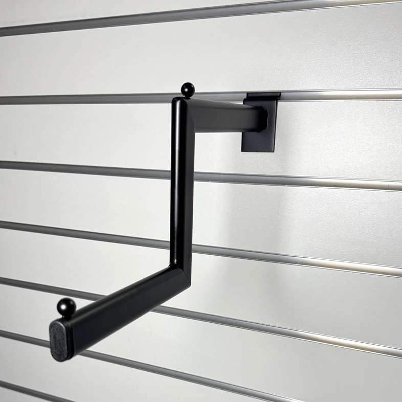 This is a step arm for Slatwall, occasionally referred to as a stepped arm. These Slatwall arms are manufactured from a flat oval tube. It measures 25 mm (1 inch) by 12 mm (0.5 inch) and projects 330 mm (13 inch) from the panel.